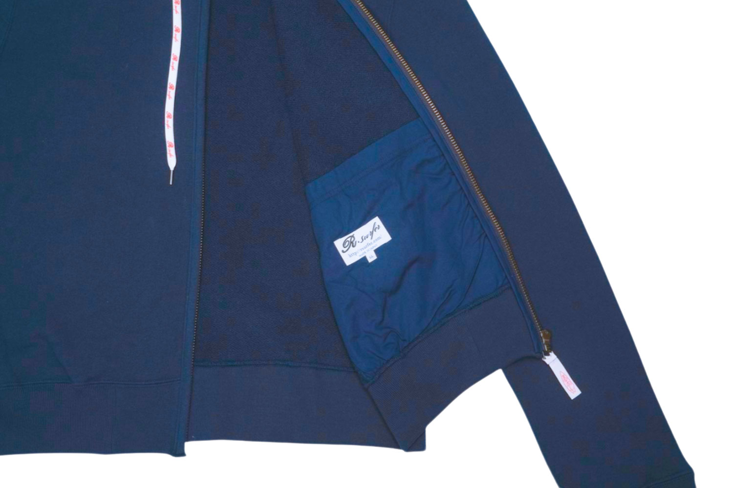 フーディの紐にはアイデンティティのR.surferが入っています。本体のネイビーは西選手が愛用するサーフボード、そしてR.surferの文字は西選手のトレードカラーのレッドとしました。ジッパーの引き手(取り外し可能)にもレッドのEMBODIMENTが刻印されております。