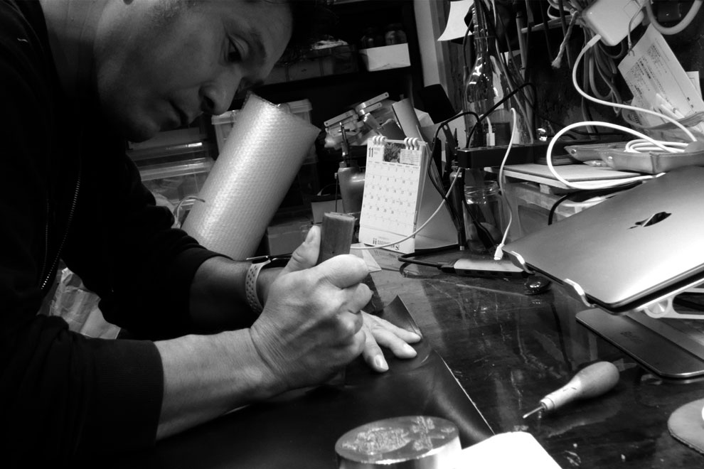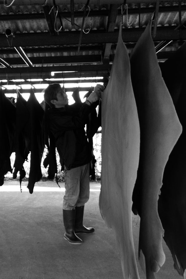 毛根を除去し、分割カット、厚み調整、乾燥、塗装や加工などを施し、クライアントの求めるレザーとなっていきます。R.surferのレザーは型押しせず人の手で揉み、自然の風合いをもった皺を刻んでいます。あがってきたレザーは、商品の形状によって漉きを施し、コバ塗などを手作業で進めていく。特に張り合わせや縫いなどでは皺が寄るので難しい。こうして仕上がるのがレザー商品です。